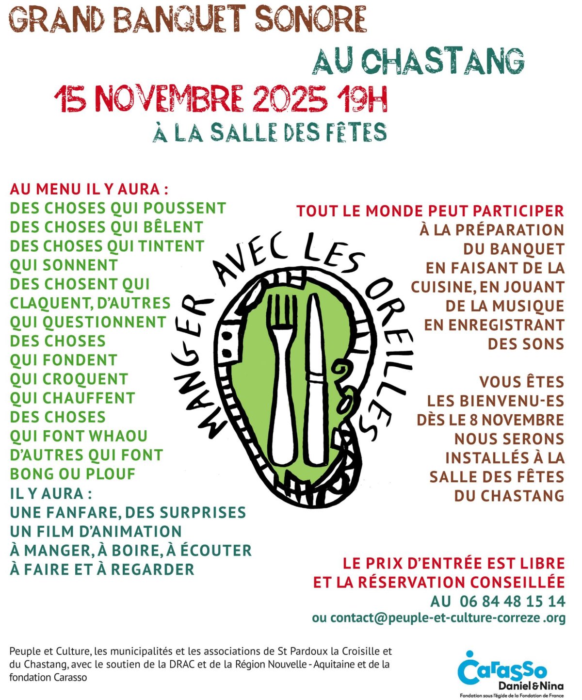 Invitation des Ateliers du Spectacles [Paris] à rejoindre l'équipe pour une construction avec les habitant-es des villages St-Pardoux La Croisille et Chasang [Corrèze]. Une histoire autour des sons et de la nourriture que nous fabriquons avec les habitant-tes et les associations locales pour aboutir à un grand dîner sonore orchestré en le 15 novembre 2025.