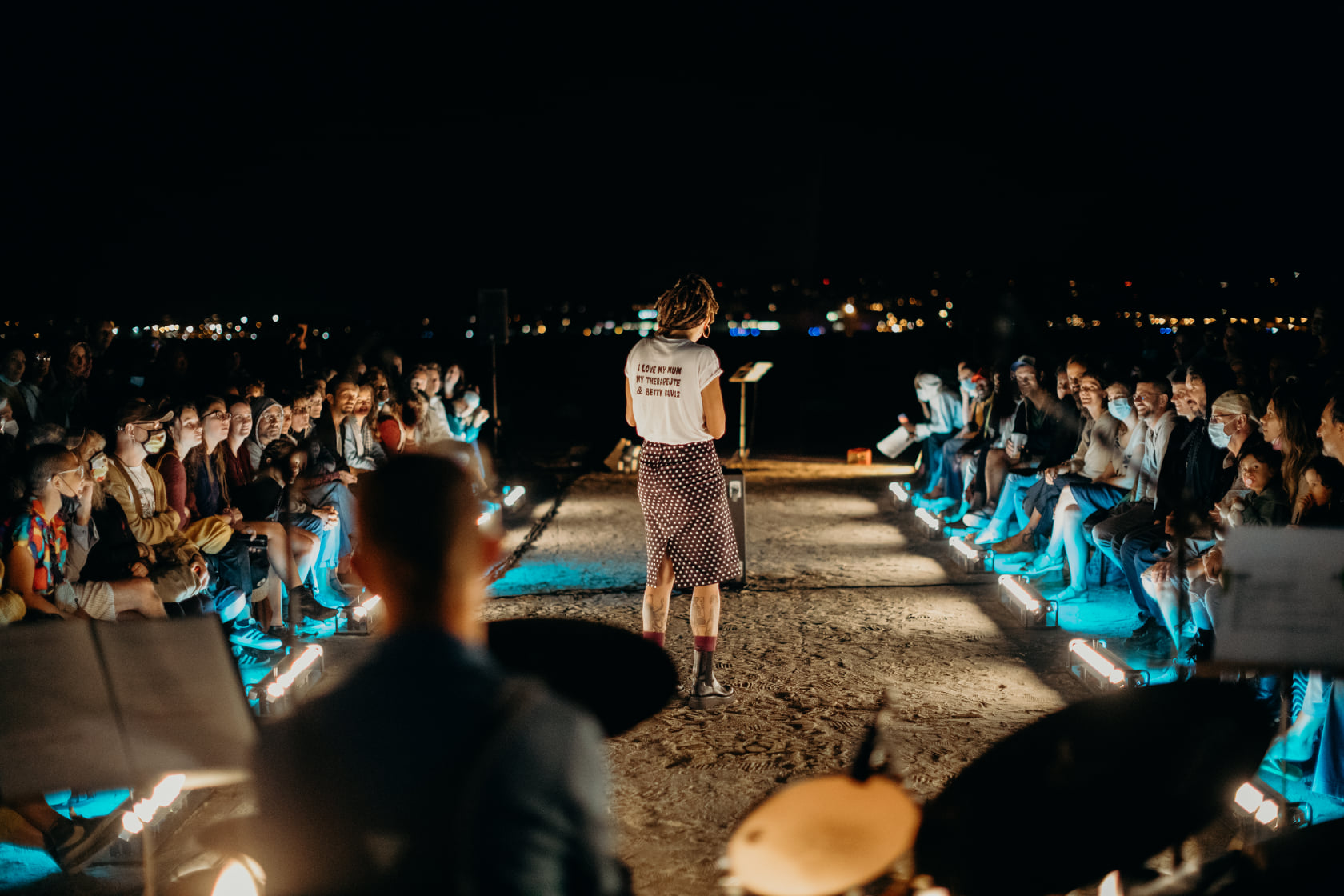 Poème-émission-radio, une performance à la croisée de la poésie sonore et du débat mis en scène. Un duo batterie-voix entre Thomas Lippens et Pina wood. Au cœur de ce spectacle, la volonté de placer le public au centre de l’interrogation. Pina Wood conçoit des objets performatifs hybrides, pour l’espace public, qui interrogent notre rapport à la langue, à l’écoute, à ce qui nous relie.